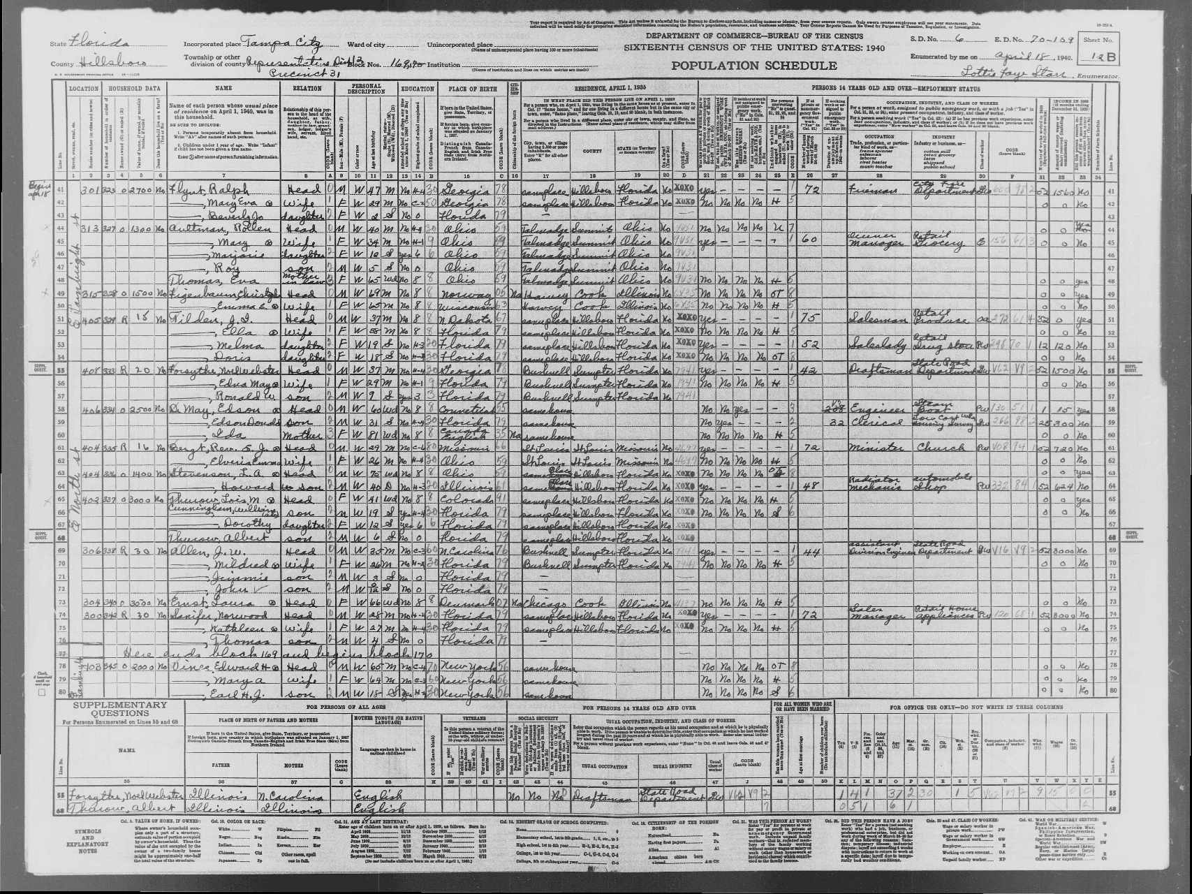 By the 1940 Census, James and Ello are living in Tampa City with their two daughters. James and Ello divorced before 1929, when Ello married Lewis Malchus Messer, whom she divorced before 1942 and remarried James Ingwold Tilden in 1942. They are living together in 1940 but did not remarry until 1942 in Osceola County, Florida.