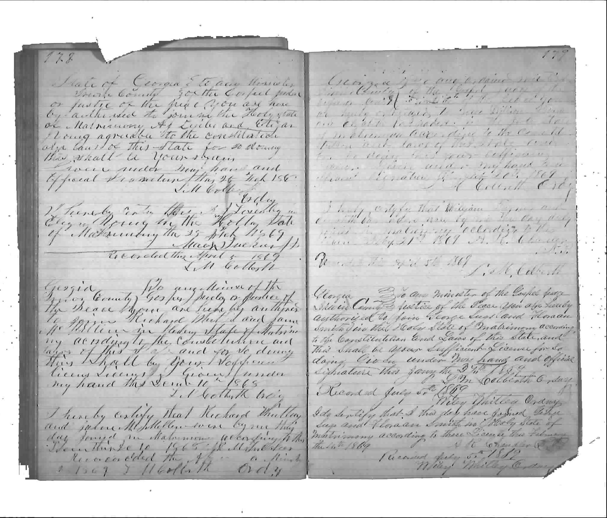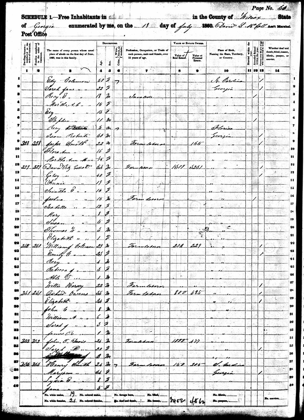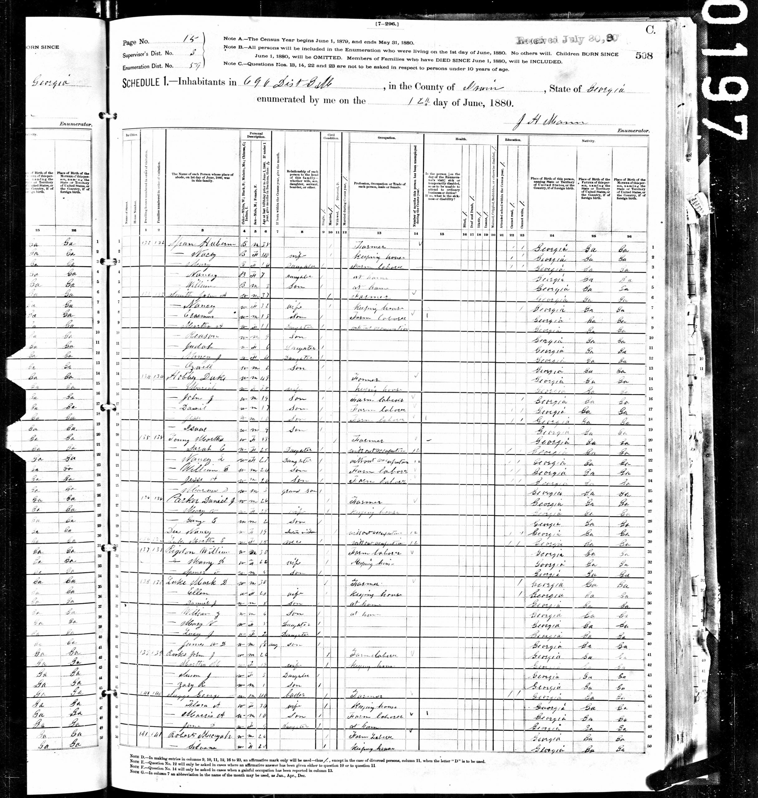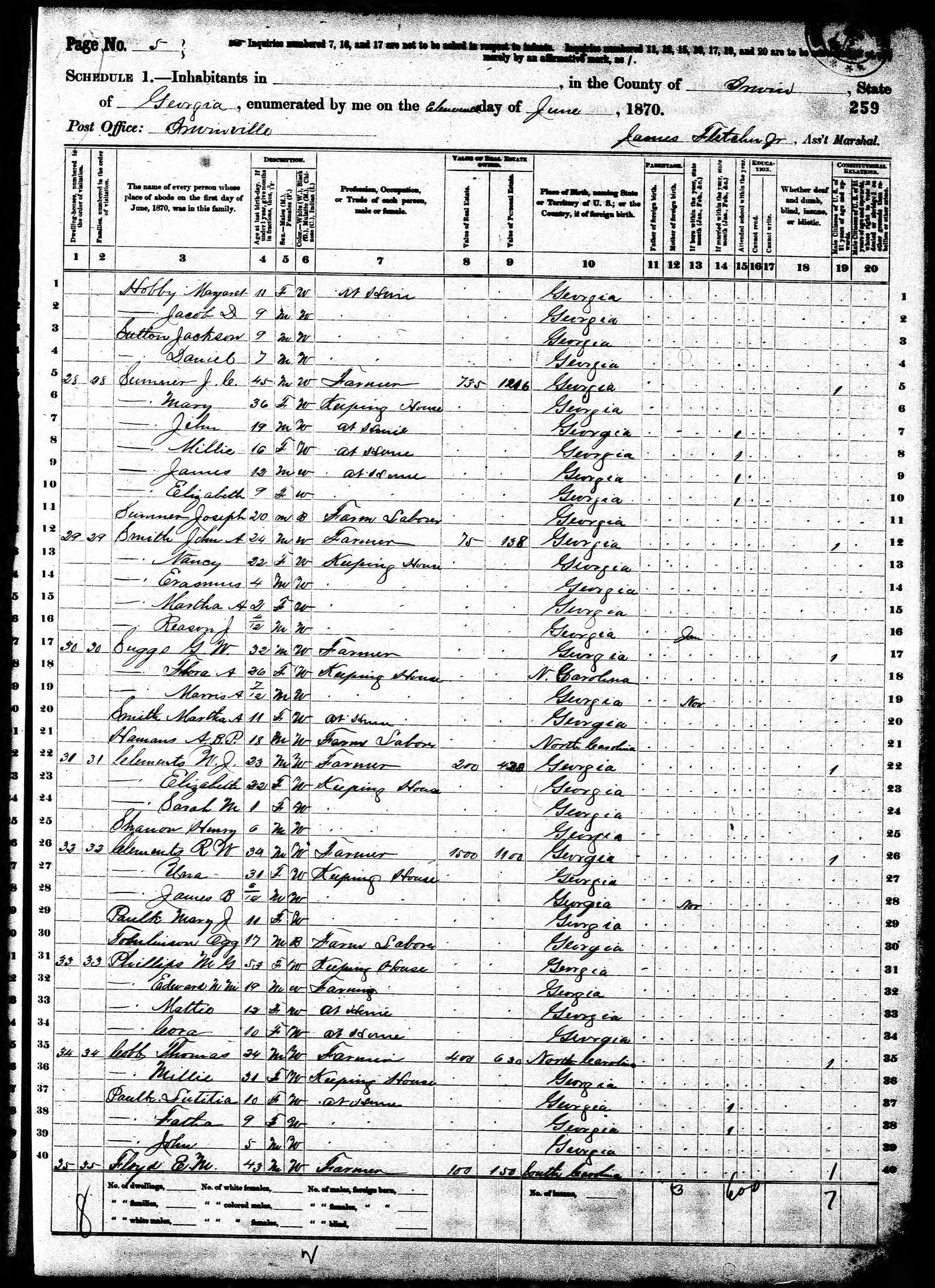Flora Ann Haman married first Jasper Smith on the 20th Feb 1859 in Wilcox County, Georgia and had one daughter, Martha Ann Smith. Jasper Smith was born cir. 1837 in Irwin County, Georgia to Jonathon Smith and Nancy Flanders and died 27 Nov 1862 in Danville, Virginia during the Civil War. After the death of Jasper Smith, she married George W. Suggs, who was born either 3 Sep 1839 or 3 Mar 1843 in Sumter County, Georgia. Flora and George had two children that I know of; Morris and June Suggs.