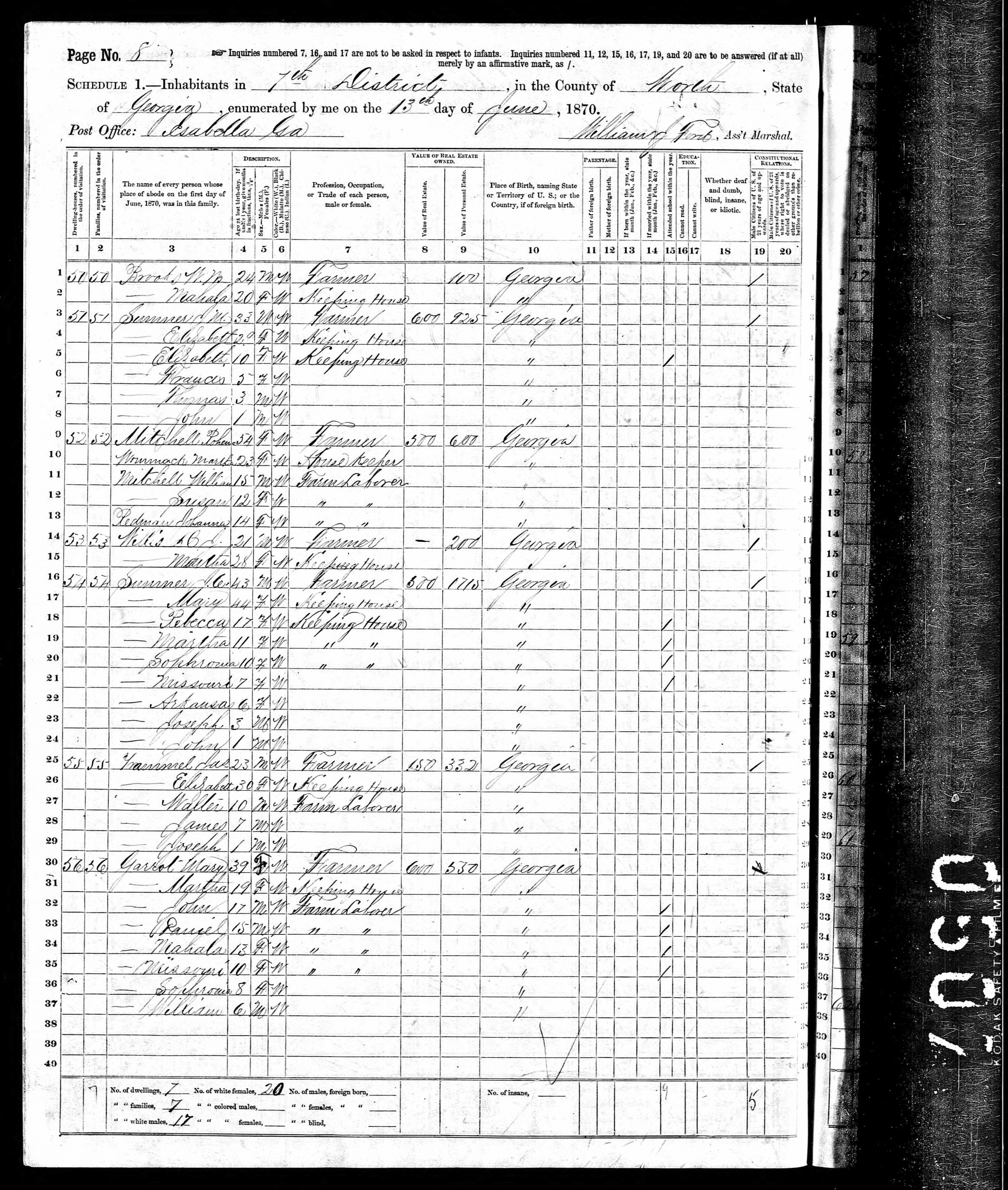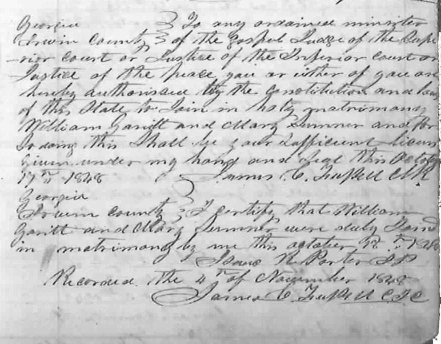 Mary Sumner married William Garrett on the 17th of October 1848 in Irwin County, Georgia. The 1860 Federal Census is incorrect listing William as 38 and Mary as 39, when the correct age should have been 33 and 29. This is proven by Mary being listed as 19 in 1850 and 39 in 1870.