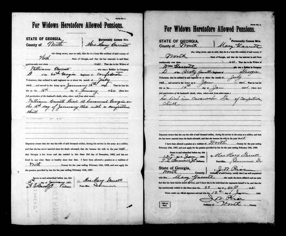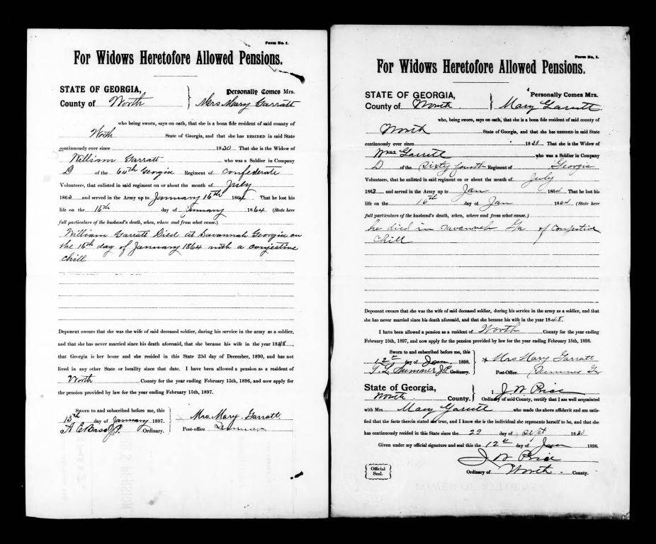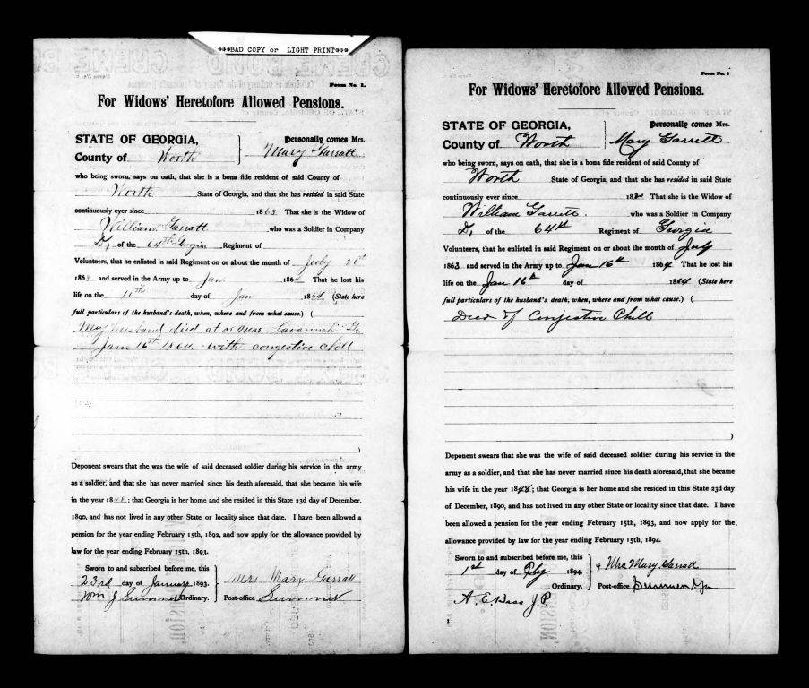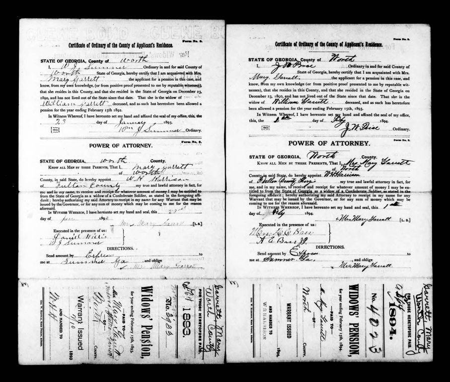 Mary Sumner Garrett died on the 2nd of December 1901 in Worth County, Georgia and is buried in the Sumner Cemetery, Sumner, Worth County, Georgia. Her husband, William Garrett died in the Civil War in or near Savannah, Georgia of Congestive Chill on the 16th of January 1864. Mary Sumner Garrett never remarried.