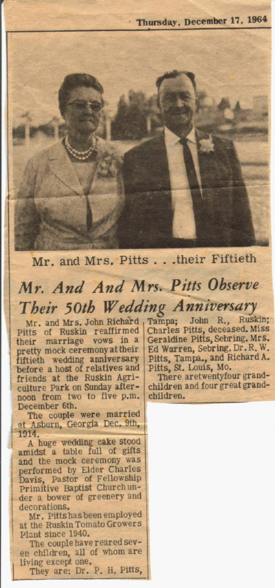 Retha Mahala Haman died on the 6th of February 1986 in Highlands County, Florida and is buried next to her husband, John Richard Pitts who died on the 5th of October 1973 in Hillsborough County, Florida in the Fellowship Primitive Baptist Church Cemetery, Fort Lonesome, Hillsborough County, Florida.