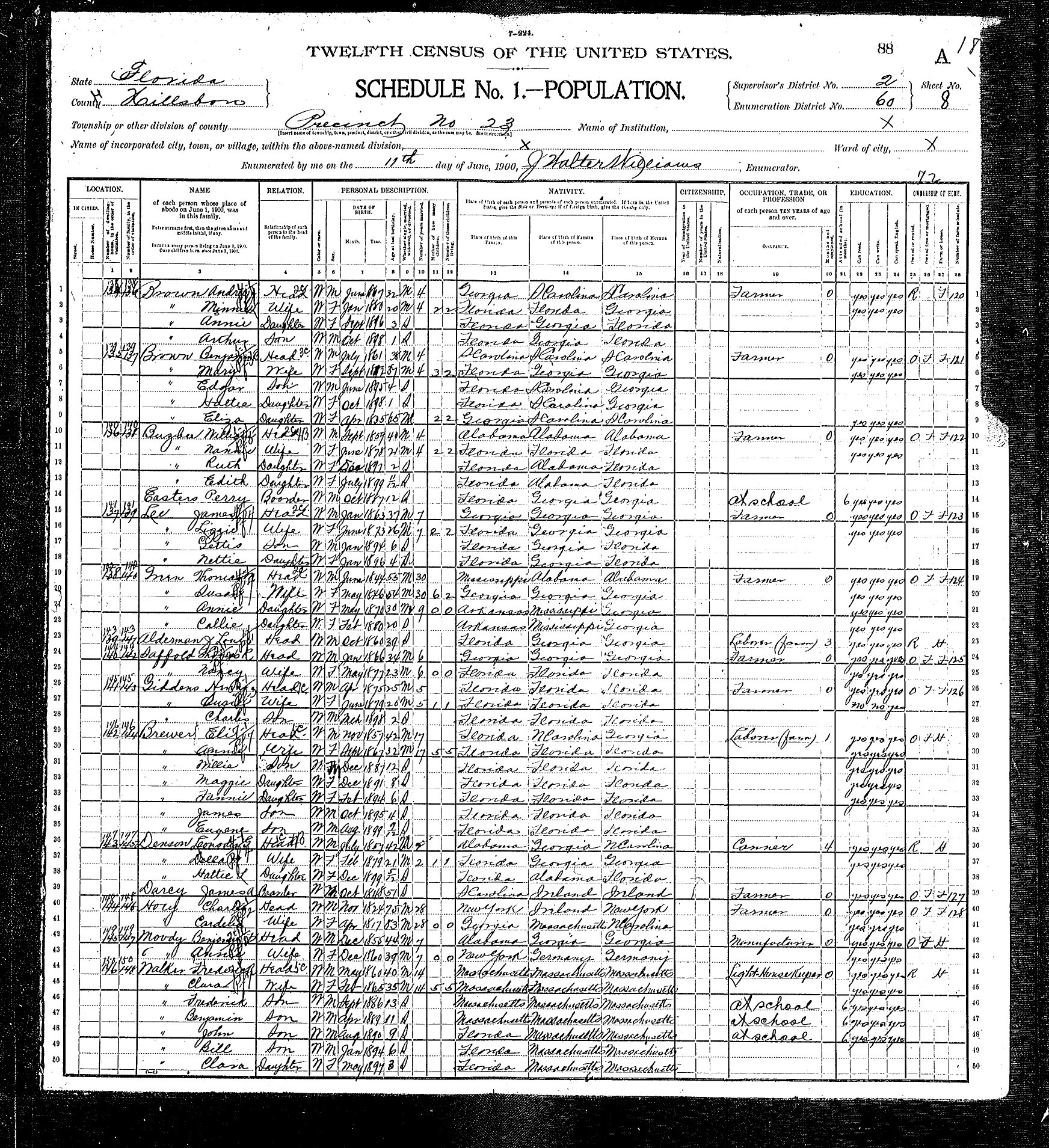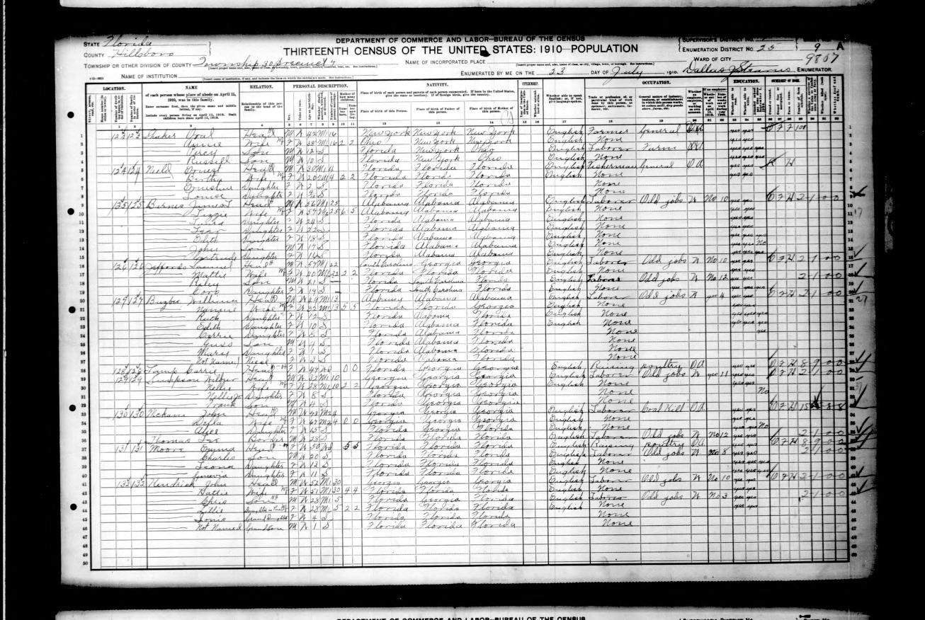 Working as a logger for the next 10 years or so, he finally married and settled down to farming. On 23 Feb 1897, William Oliver Buzbee married Nancy Elizabeth Thompson. William and Nancy raised 9 children in a small farming community called Oak Ridge, which is thought to have been somewherre outside of Riverview, in the Bell Shoals area. William, in his later years, gave up farming, worked as a prison guard and later as a night watchman in his retirement. Emma Ruth Buzbee was born 25 Dec 1897, Edith Marian Buzbee born 25 Jul 1899, Carrie Belle Buzbee born 1902, William Augustus Buzbee born 1907, Mary Elizabeth Buzbee born 1909, James Murdock Buzbee born 14 Mar 1911 and died 06 Feb 1951. James Murdock Buzbee married Christine McCoy Moore in 1941 in Hillsborough County, Florida. Laura Myrtice Buzbee, twin to James Murdock Buzbee, born 14 Mar 1911 married Farrell Everard Hill in 1933 in Hillsborough County, Florida. Annie Byrd Buzbee was born 14 Jun 1913 and died 23 Jun 1983. Annie Byrd Buzbee married Gene C. Gordon in 1931 in Hillsborough County, Florida. Frank M. Buzbee born 14 Sep 1915 and died 03 Sep 1956, he married Elizabeth Caldwell in 1936 in Polk County, Florida. Frank M. Buzbee is listed as married in the 1940 census living in his mothers household, where is his wife?